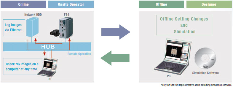 You can store NG image in a network HDD to check the NG images every day on a computer without reducing inspection performance. Or you can start simulation software on your computer to remeasure and analyze NG images.