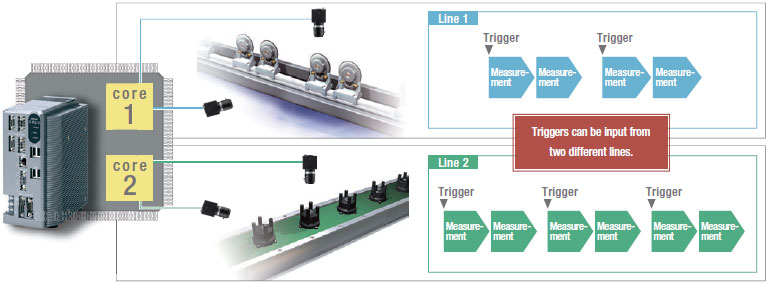 With quad processors, different triggers from two lines can be input to one Controller to process two scenes in parallel and yet independently. Even if one line stops, the lines are completely independent of each other, so the other line continues to operate.