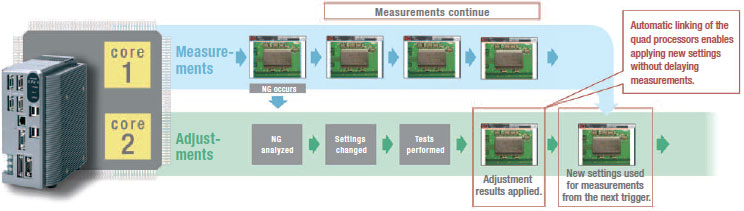 Parallel processing on quad processors not only speeds up measurements, but it enables parallel processing of measurements and adjustments. Automatic distributed quad processing means that measurements are not delayed when adjustments are applied.