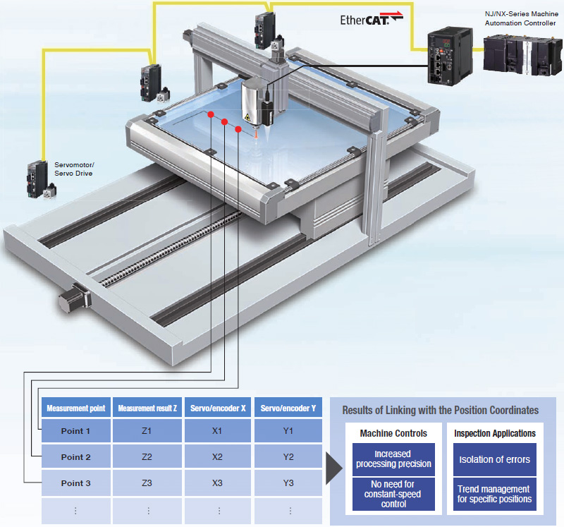 EtherCAT can be used to connect to servo drives or encoder input slaves to quickly get the position coordinates and ZW displacement. The height information and XY position coordinates can be easily linked so that the machine control applications can increase processing precision in respect to the height and the inspection applications benefit from maintenance, such as helping to isolate errors or perform trend analysis.