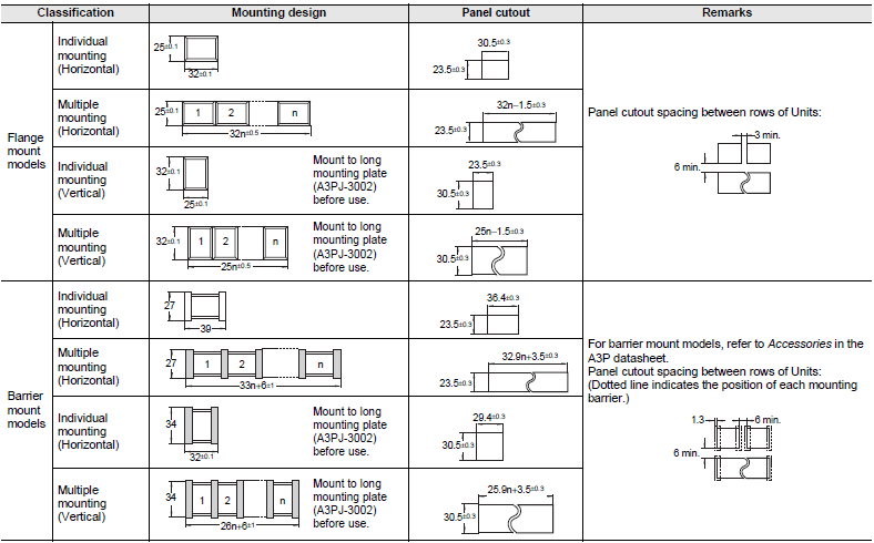 (If you use a Switch Guard or Seal Cover, refer to Switch and Guard Mounting Dimensions or Seal Cover Mounting Dimensions in the A3P datasheet.)