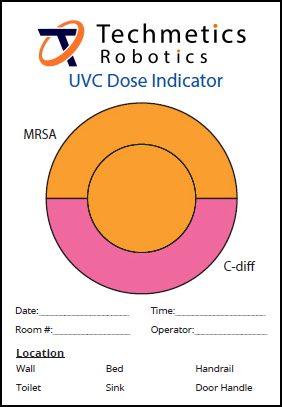 The UVC Dose Indicator is a safe and efficient tool used to verify UVC exposure levels when using ultraviolet devices for surface disinfection. They are calibrated to indicate color changes up to 100 mJ/cm² .When exposed to UVC rays, the yellow indicator changes to orange and pink, which has been correlated to an accumulated dose sufficient to kill MRSA and C. Diff, respectively.